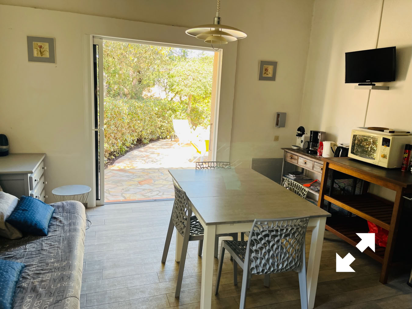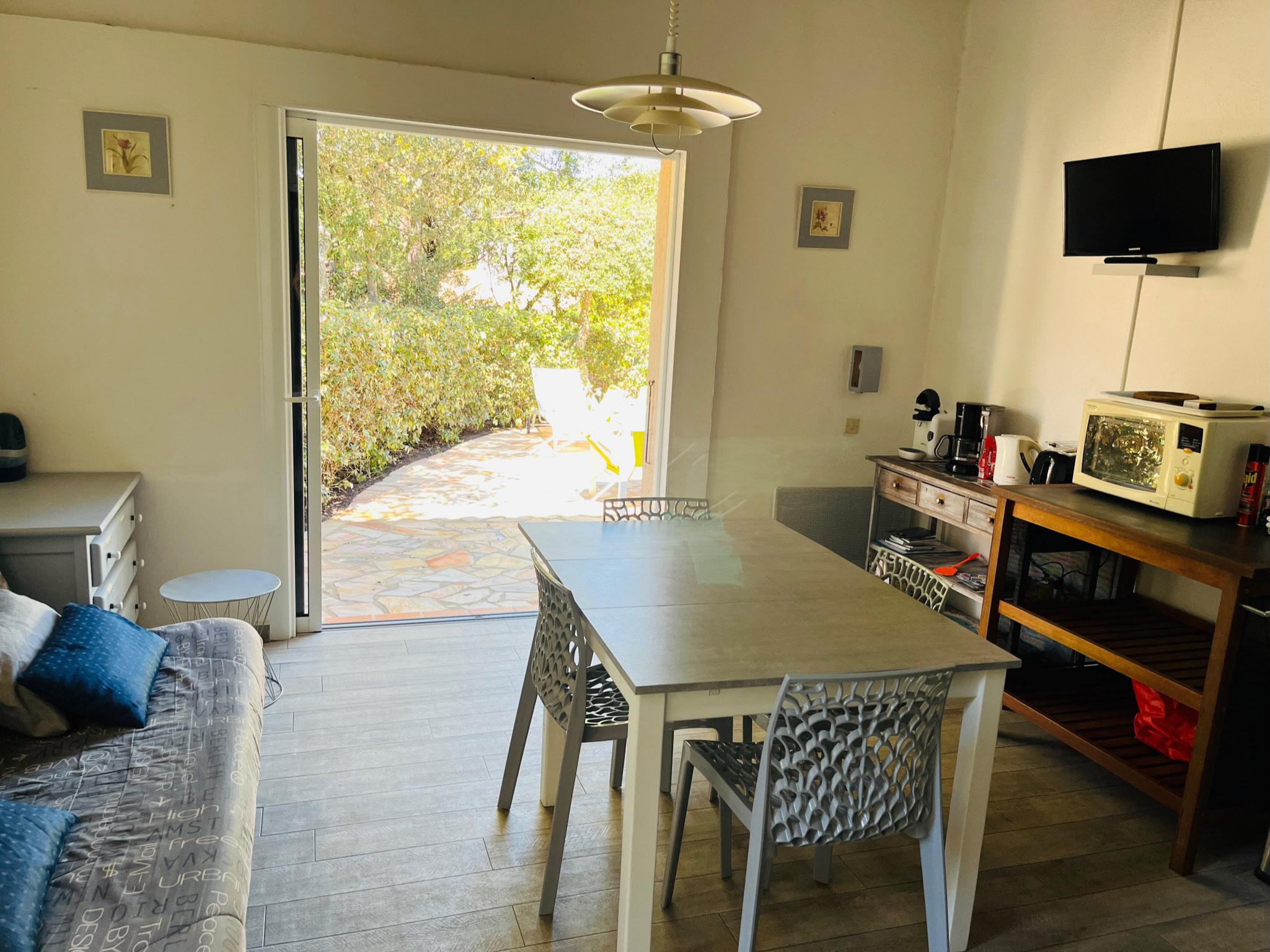 Le coin cuisine est équipé d’une plaque vitro-céramique, d’un lave-vaisselle, four-grill micro-ondes, grille pain, bouilloire électrique , machine à café filtre et Tassimo, réfrigérateur-congélateur, TV, table chaises, chaise haute pour bébé,